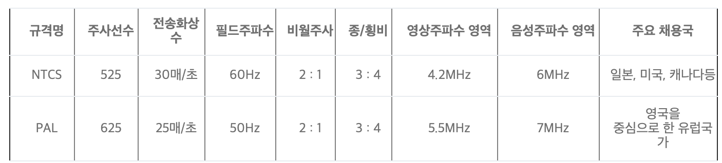 ※ 아래의 표는 NTSC/PAL의 주요제원입니다